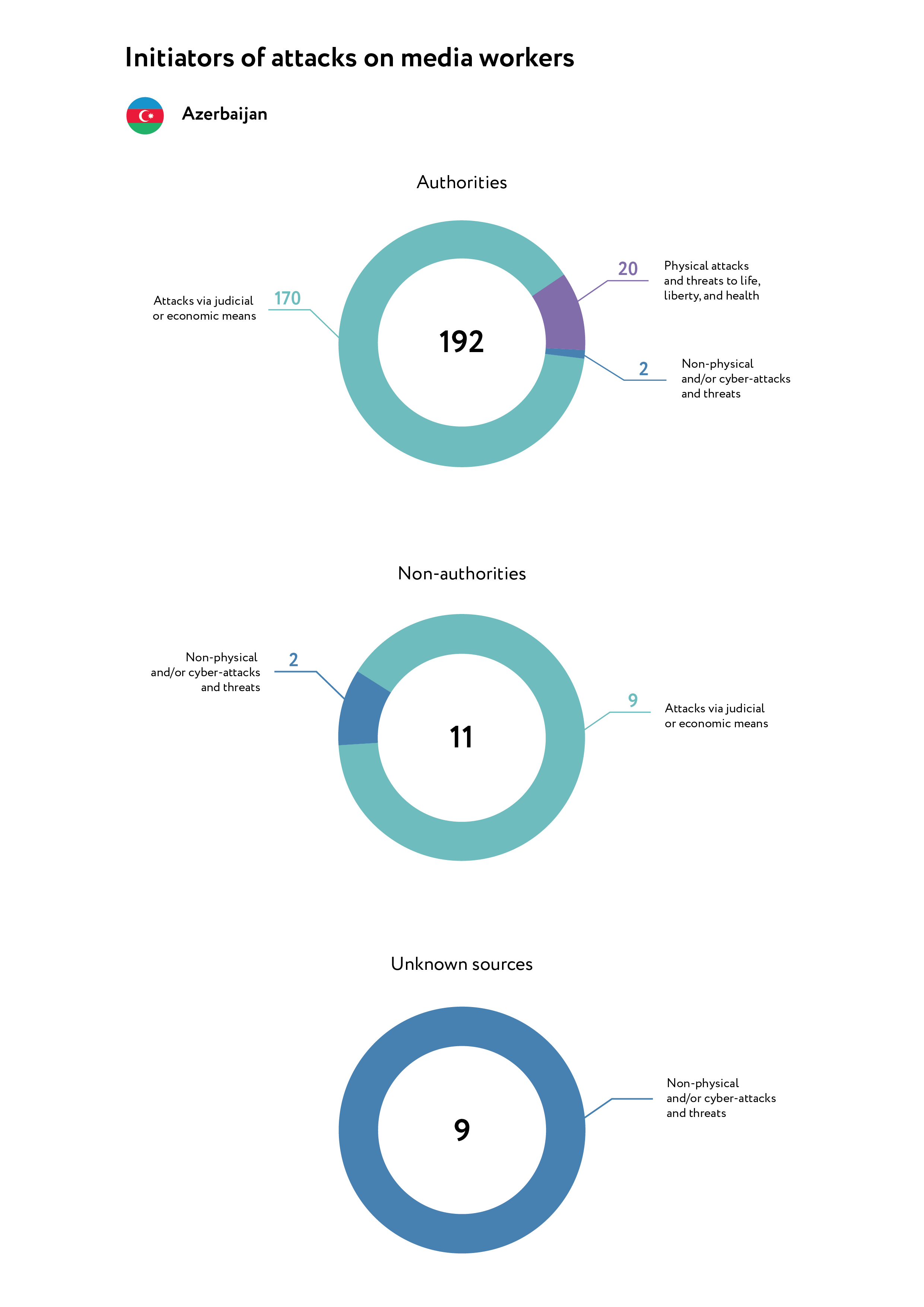In Azerbaijan, 211 incidents of attacks/threats against professional media workers and editorial offices of both traditional and online publications were identified and analysed in the course of the study for 2025. Data for the study were collected using open-source content analysis in Azerbaijani and English. In addition, information about these attacks was obtained from the statements by journalists, bloggers, and lawyers providing legal assistance to them. A list of the main sources is provided in Annex 1.