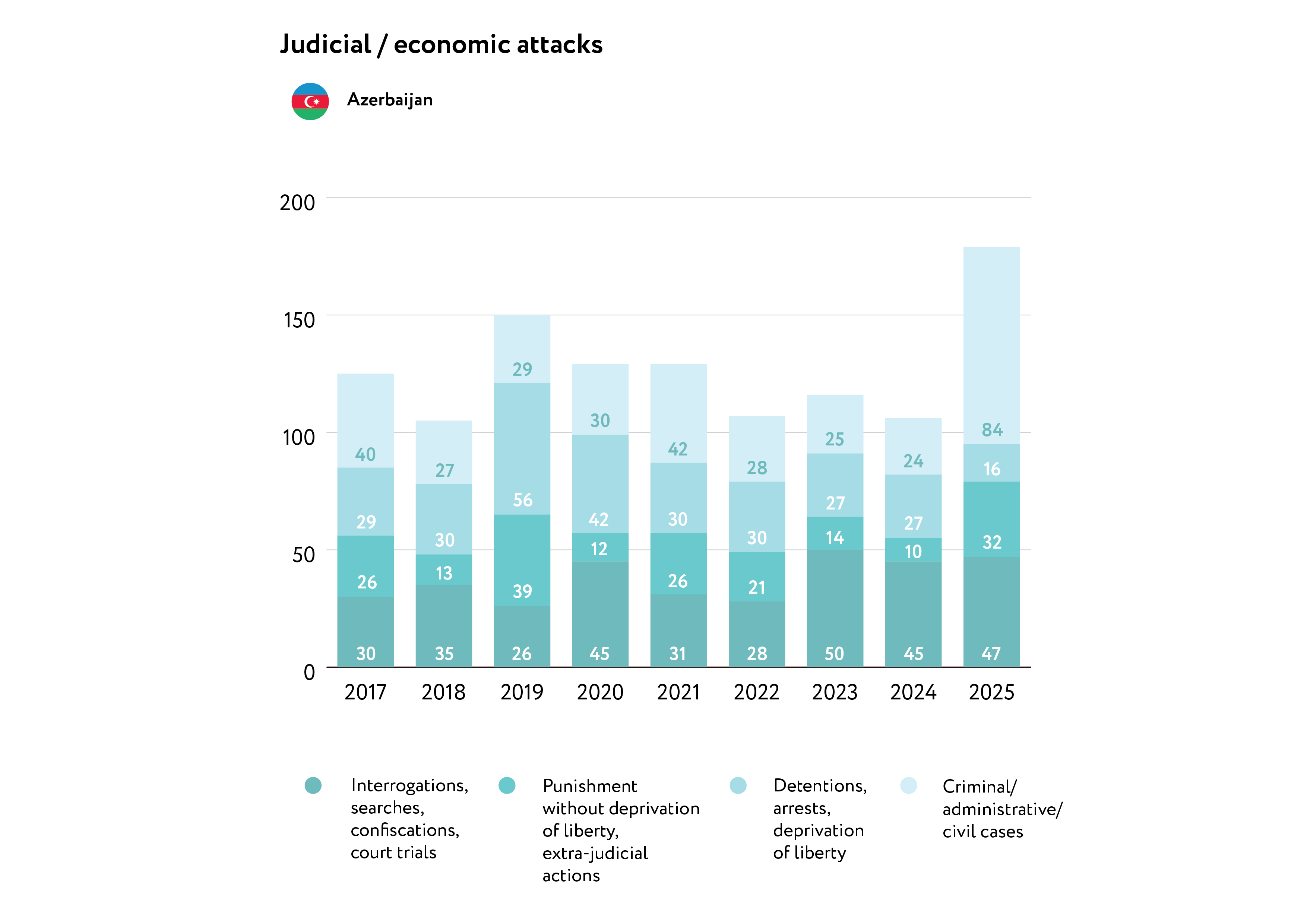 In 2025, 211 attacks against journalists, bloggers, and other media workers were documented in Azerbaijan. This figure matches the number recorded in 2021. At least 90% of these attacks were perpetrated by representatives of state authorities.