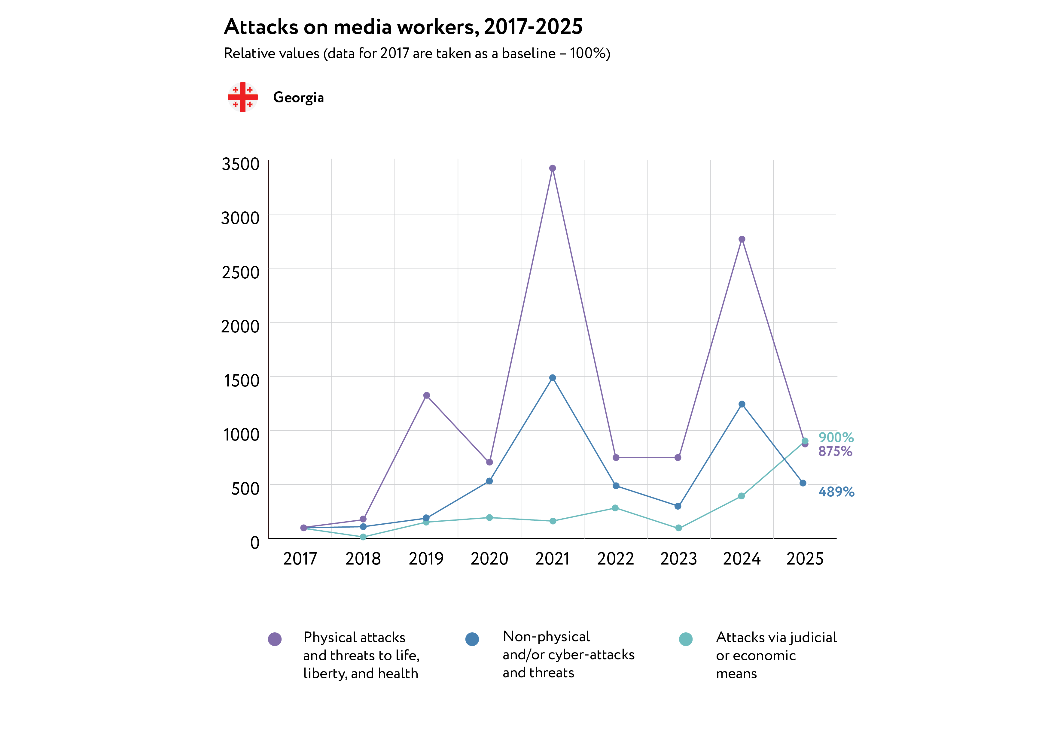 In 2025, Georgia fell 14 places – to 114th – in the World Press Index published by Reporters Without Borders (RSF). The state of media freedom continued to deteriorate: in 2024, Georgia fell 26 places, and in 2023, 29 places. “The media landscape is diverse and, at the same time, highly politically polarised. Manipulation, hate speech and disinformation are widespread in the media, especially on television, the main source of information,” the RSF report states.