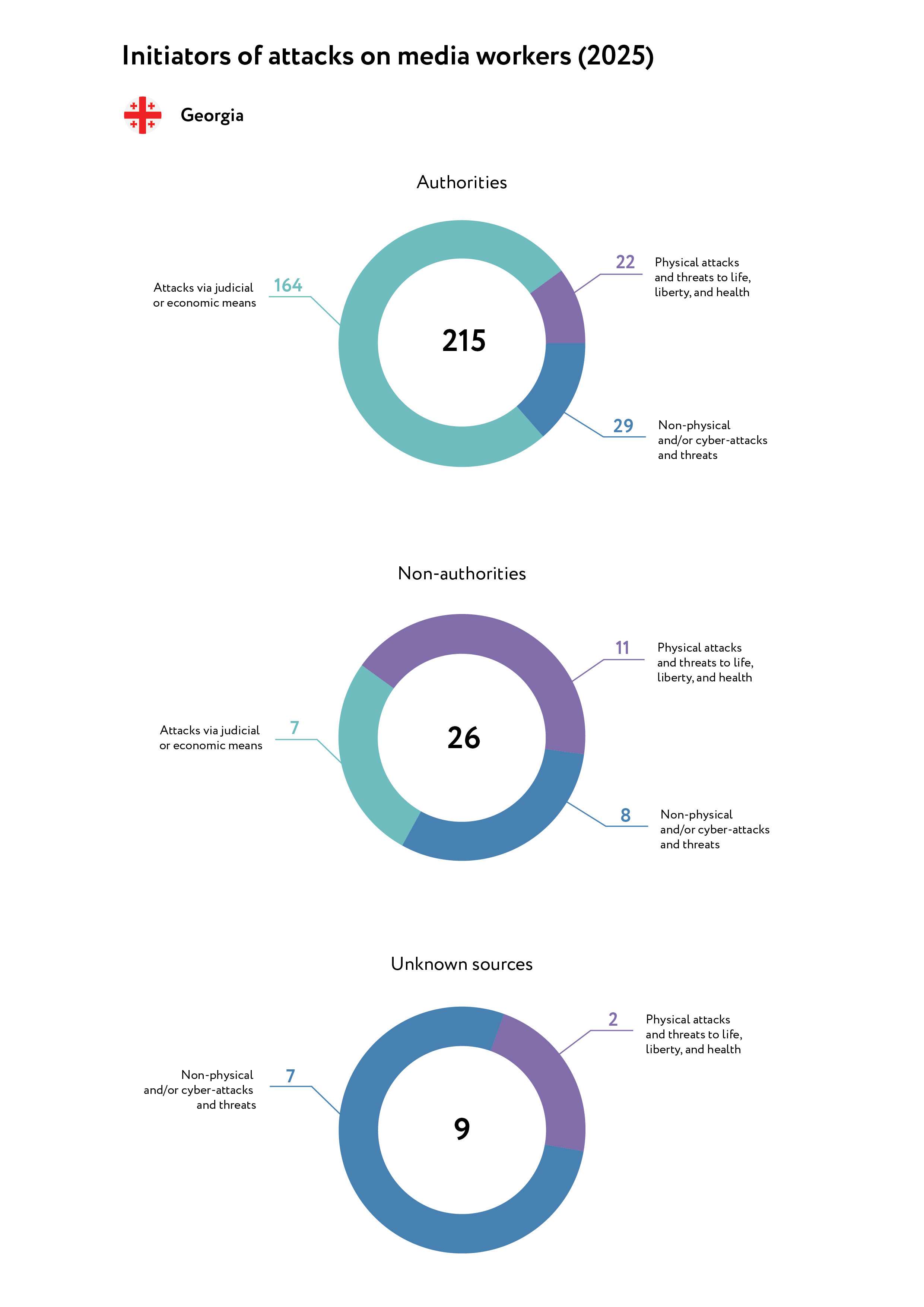 In Georgia, 250 cases of attacks/threats against professional media workers and editorial offices of both traditional and online publications were identified and analysed in the course of the study for 2025. This figure is consistent with 2024, when 298 incidents related to threats and abuse of media workers were recorded. Data for the study were collected using open-source content analysis in Georgian, English, and Russian. A list of the main sources is presented in Annex 1.