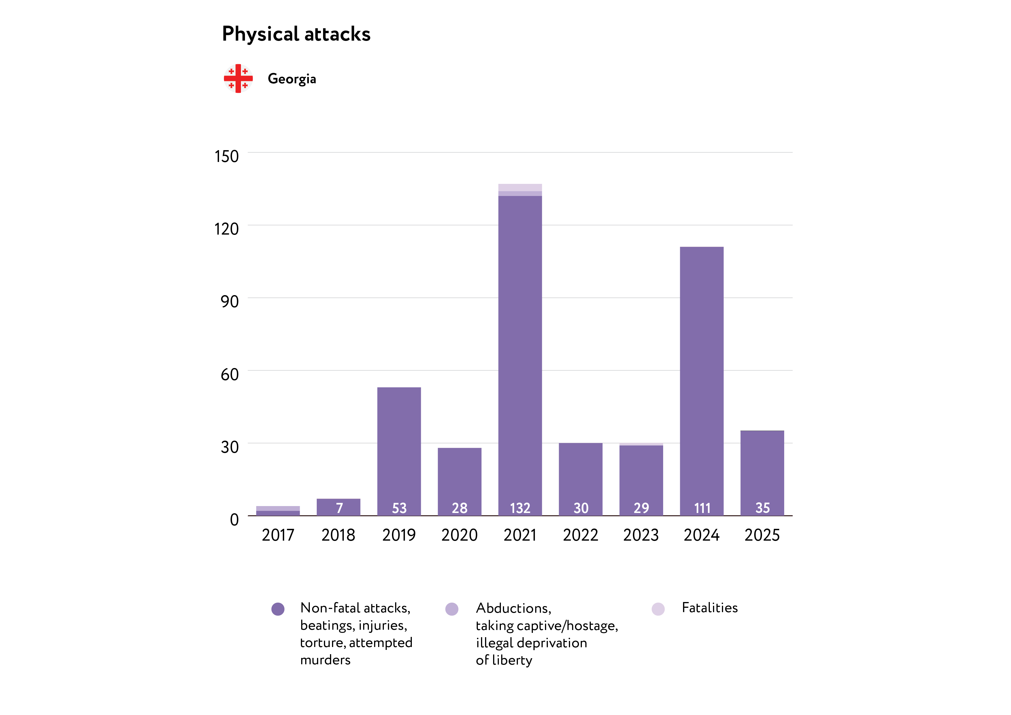 35 incidents of physical attacks and threats to life, liberty, and health were recorded – almost three times fewer than in 2024. All incidents were non-fatal. 22 of these cases were perpetrated by representatives of the authorities. The majority of the attacks occurred while journalists were covering anti-government protests, primarily on 2 February, 8 September, and 4 October.