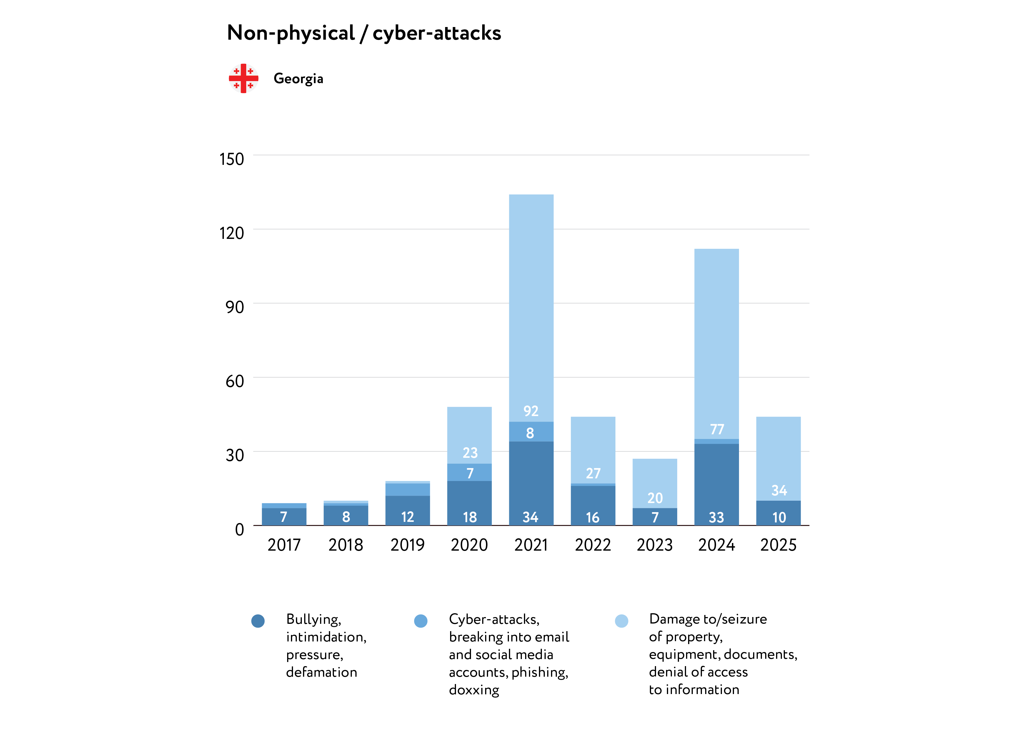 In 2025, 44 incidents of non-physical and/or cyber-attacks and threats were recorded – almost three times fewer than in the previous year. Of these, 34 incidents involved damage to/seizure of property, equipment, documents as well as denial of access to information.