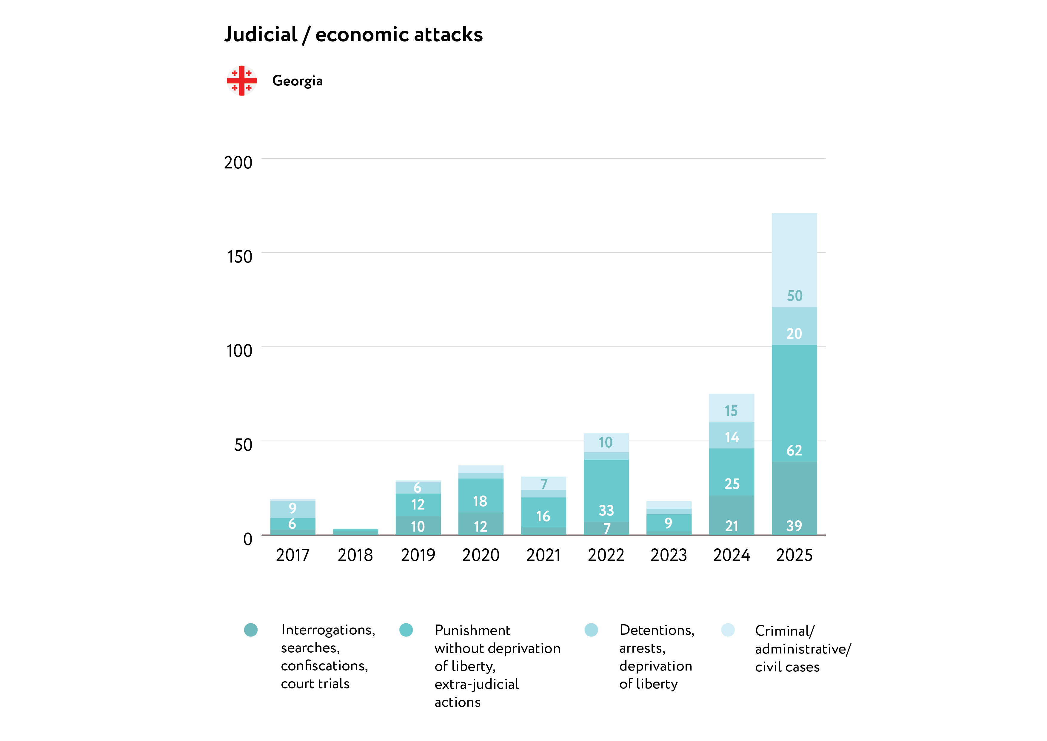 In 2025, attacks carried out via judicial and/or economic means remained the primary method of pressure against media workers, with 171 cases recorded. This represents a more than twofold increase compared with 75 cases documented in 2024. The three most common methods of attack were administrative and criminal proceedings (50 cases), fines imposed following administrative offences (40 cases), and court trials (37 cases).