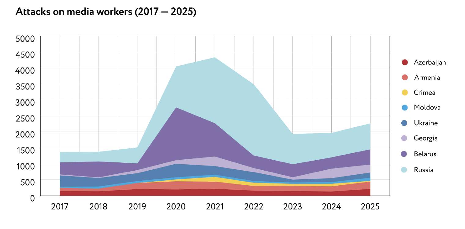 In 2025, JFJ and its partners continued to monitor developments in the media landscape across five Council of Europe member states, as well as in Russia and Belarus. The trends identified in our 2024 report persist: while Armenia, Moldova, and Ukraine maintain pluralistic and independent media environments, Azerbaijan, Georgia, Belarus, and Russia have fallen further in media freedom rankings.